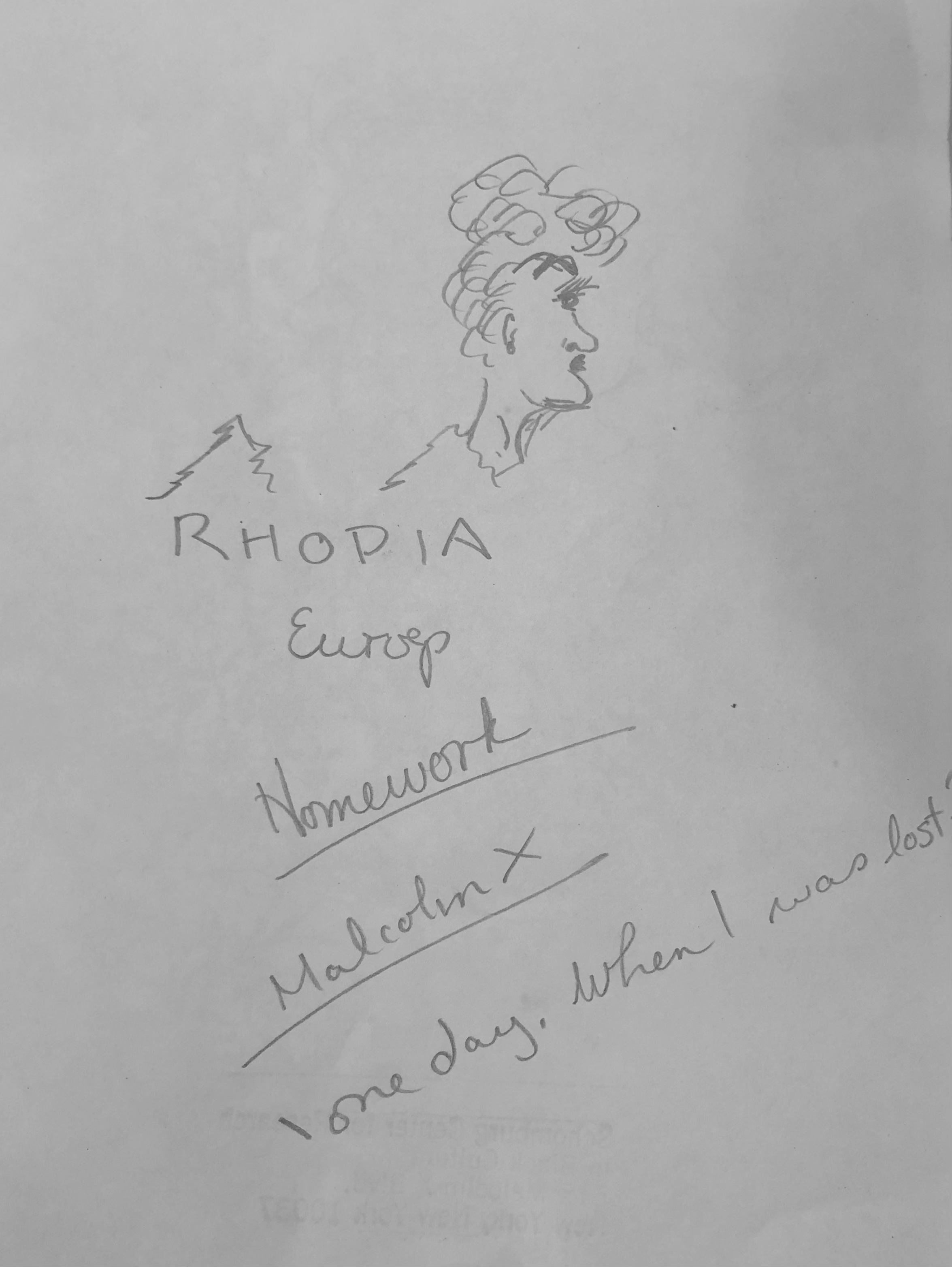 Baldwin drew faces on many of these notepads’ covers. On one of the Rhodia covers, for example, Baldwin drew a woman’s face in profile (like the image above). But this time he incorporated Rhodia’s logo: one of the trees becomes the woman’s shirt collar. At the risk of embarrassing myself, here is my sketch of what was on the cover of one of the Rhodia notebooks I saw at Schomburg: