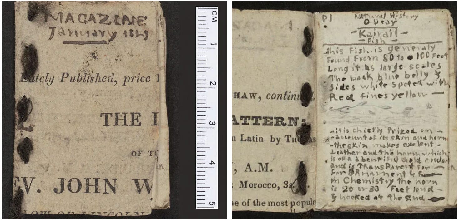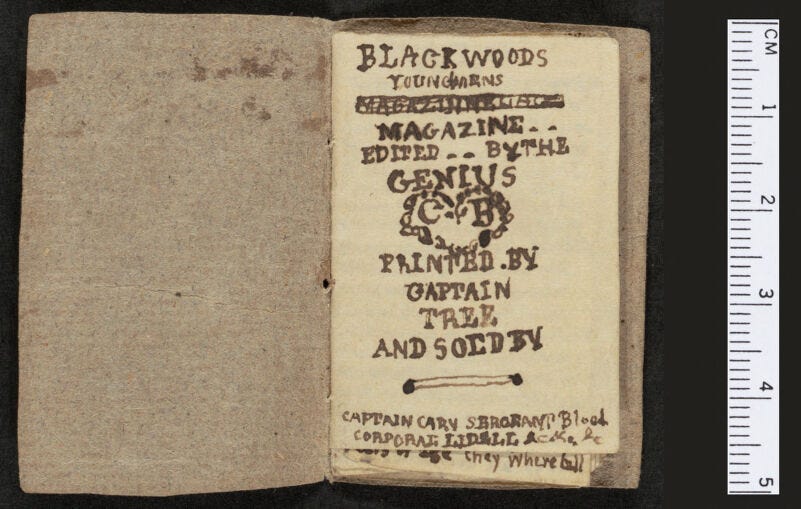 The siblings used whatever paper was at hand as covers—bags of sugar, wallpaper, or newsprint. Here Branwell repurposed an advertisement: