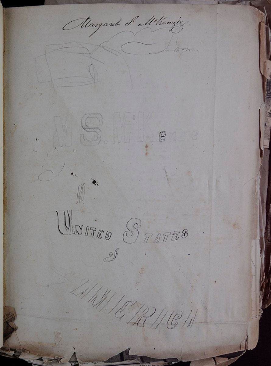 Whitman filled the scrapbook with interesting historical and geographical anecdotes. He pastes in large maps of the world, lectures on the earth’s “physiology,” and articles on astronomy. Throughout it all, the United States was never far from his mind as we see in these doodles: