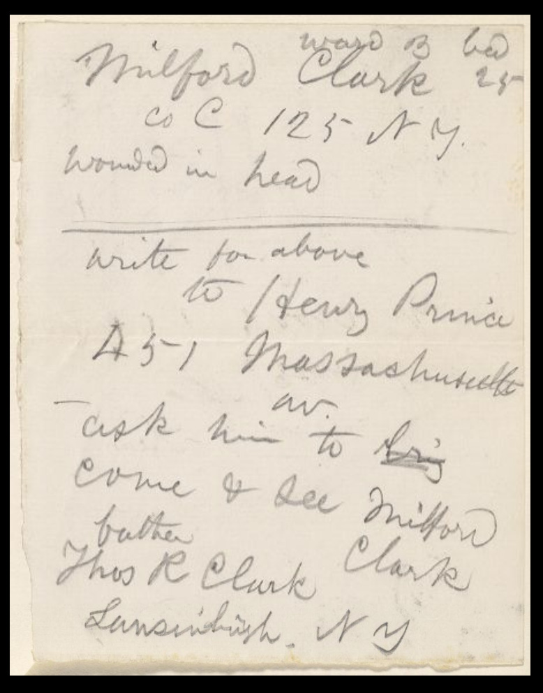 As a nurse, Whitman wrote letters on behalf of wounded soldiers. Here is one of his loose scraps of paper, reminding himself to send a letter on behalf of Milford Clark: