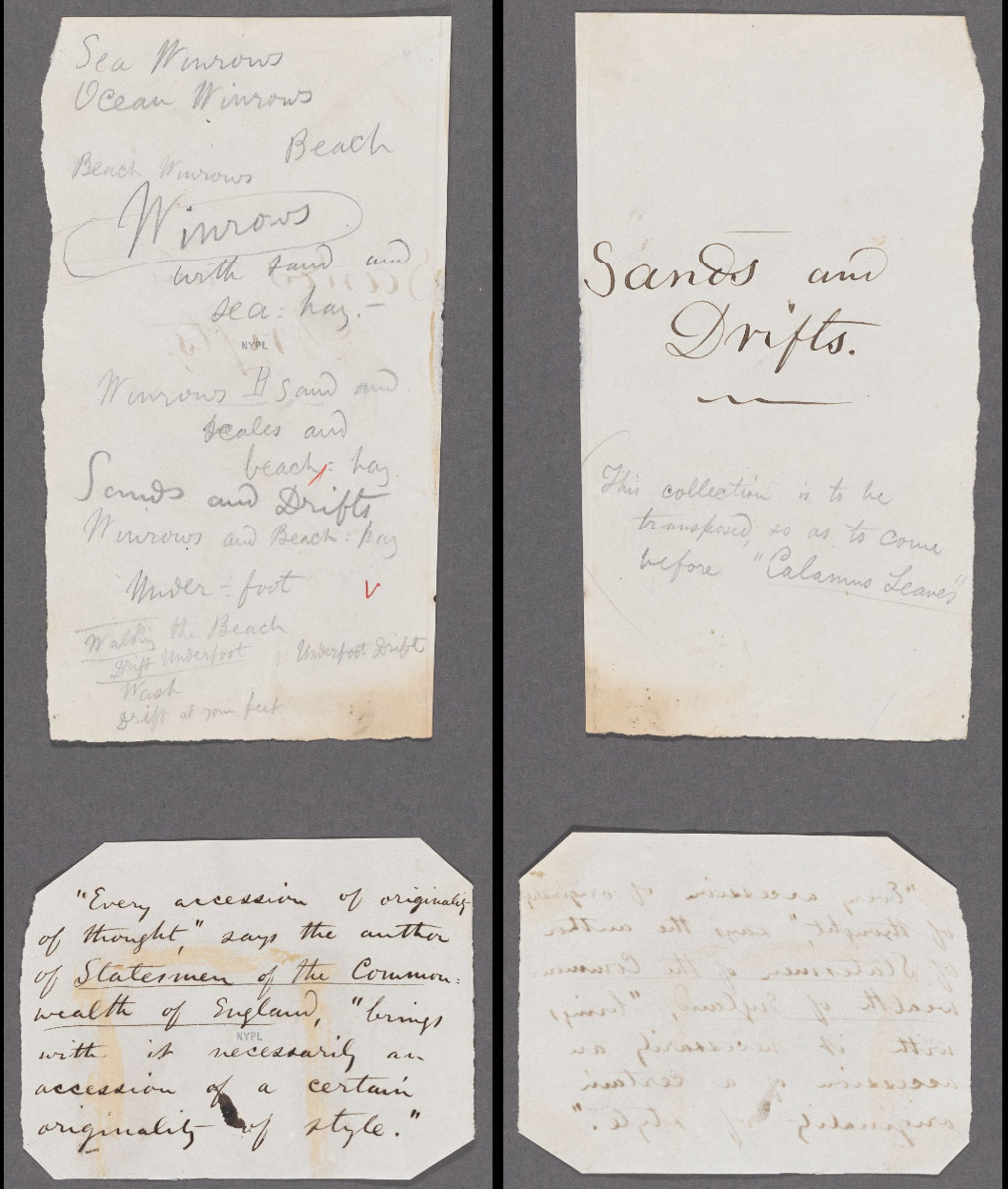 Walt Whitman was a poet of fragments. And, his writing process was incredibly splintered as he gathered scraps of paper with his scribbles. These might include bits of verse or potential titles for works. For example, he played with lots of titles for the poem that would become Leaves of Grass. At one point he considered, “Sands and Drifts” as a title for a section of the poem. It appears prominently in one of the following scraps: