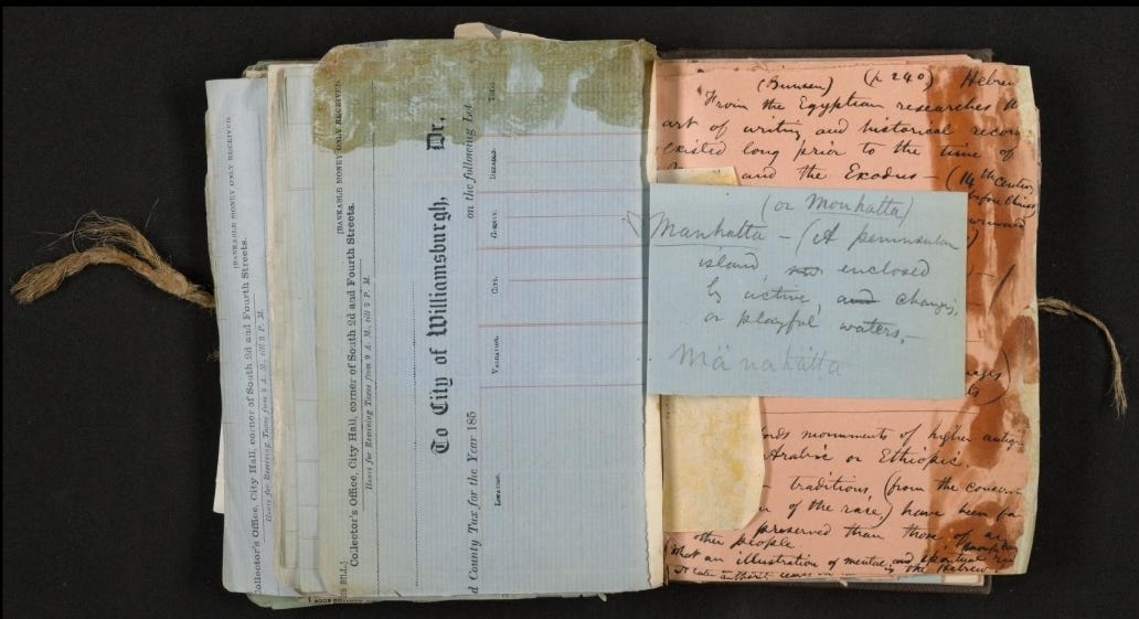 Think metaphorically: the material condition of Whitman’s notes resemble his larger poetic project—of combining disparate pieces into a cohesive unity. For Whitman, fragmentation was a creative process. Ask yourself what you are trying to accomplish with your notes. Do they take a material form that matches your ideas and ambitions?