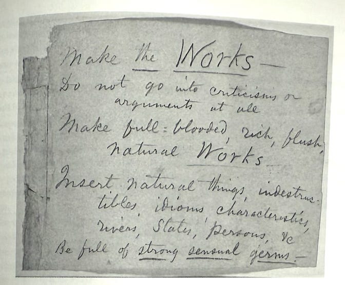 But Whitman’s greatest attempt at unifying all the discordant parts of America was, of course, Leaves of Grass. He revised it throughout his life—adding more and more fragments and scraps as he went. I’ll cover the composition of this monumental work in this week’s postscript.