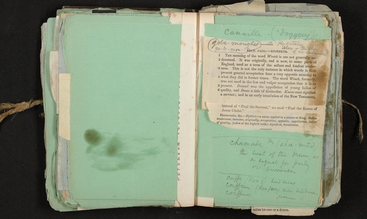 Of course, he stuffed this notebook to the brim with more of his scraps: Here he includes newspaper cuttings and handwritten notes on words like